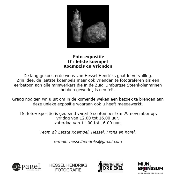 Het is zover. Vanaf 6 september is het mogelijk om de expositie van de koempel foto`s in het winkelcentrum de Parel in Brunssum te bezoeken, vanaf 10:00 uur tot 16:00 uur. Verder iedere vrijdag van 12:00 uur tot 16:00 uur en iedere zaterdag van 11:00 uur tot 16:00 uur tot en met 29 november. Er is een ruime parkeerplaats achter het winkelcentrum en bij Albert Heijn/Linders Kerkstraat 40 6441 BE Brunssum.