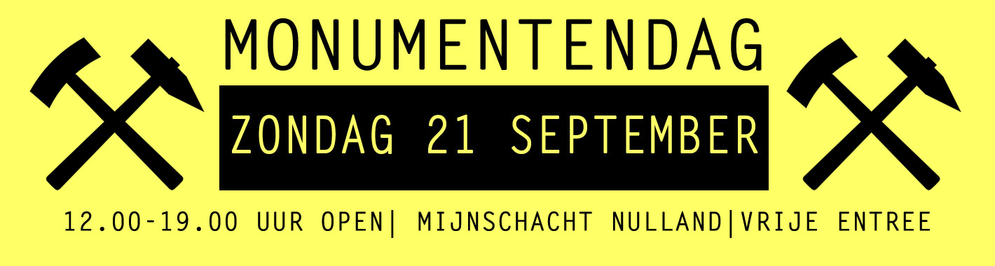 Bezoek Schacht Nulland tijdens de open monumentendag op ZONDAG 10 SEPTEMBER van 12 tot 17 uur. Ervaar het mijnverleden in ons sfeervol museum! Er is veel te zien! Schacht Nulland maakte deel uit van de Domaniale Mijn; de oudste steenkolenmijn van Nederland. De schacht staat symbool voor het mijnverleden van Kerkrade. Luister naar de verhalen van gepassioneerde oud-mijnwerkers. Neem een persluchthamer in de hand en ervaar hoe zwaar het ondergrondse werk was.